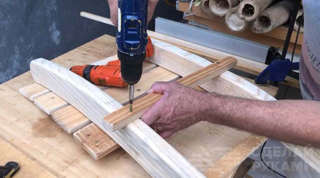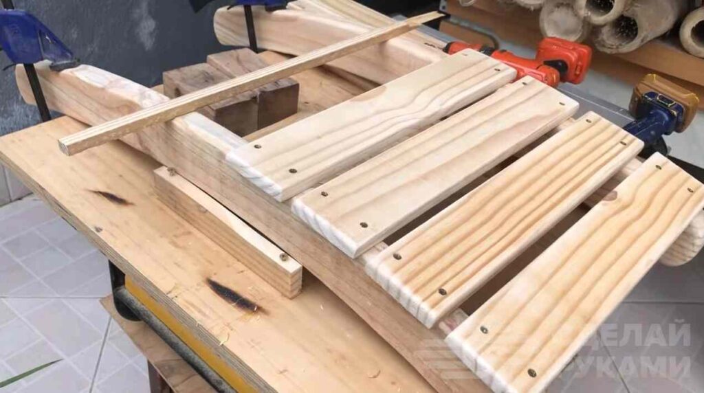 Спинку делаем из оставшихся двух ножек и четырех дощечек. В качестве крепежа автор использует саморезы.