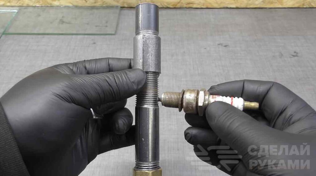 Сбоку трубы сверлится отверстие и приваривается гайка, в которую будет вкручиваться свеча зажигания. В гайке надо будет нарезать другую резьбу.