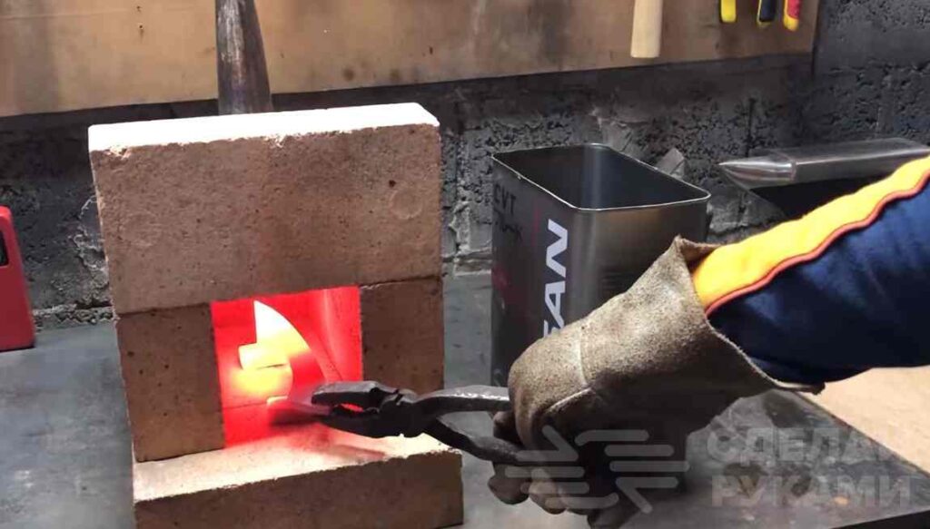 Первым делом автор отрезает у напильника хвостовик. В данном случае он не пригодится. Затем нагреваем заготовку в горне и оставляем там до полного остывания.