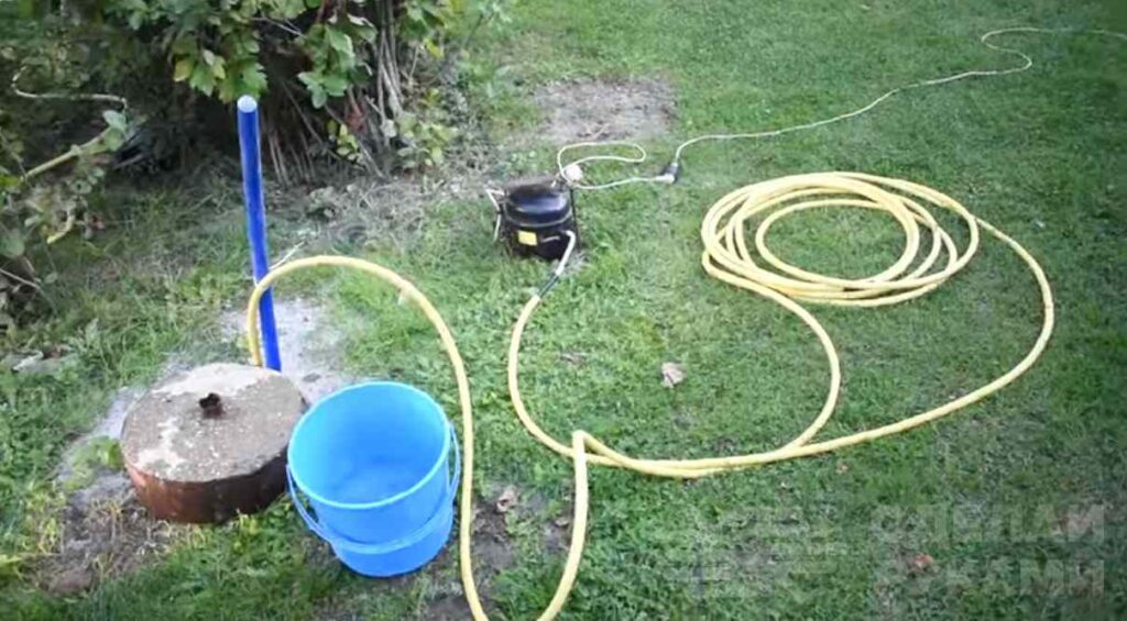 Подсоединяем свободный конец ПВХ шланга к резиновому патрубку на компрессоре. Потом включаем компрессор, и можно набирать воду в ведро или другую емкость.