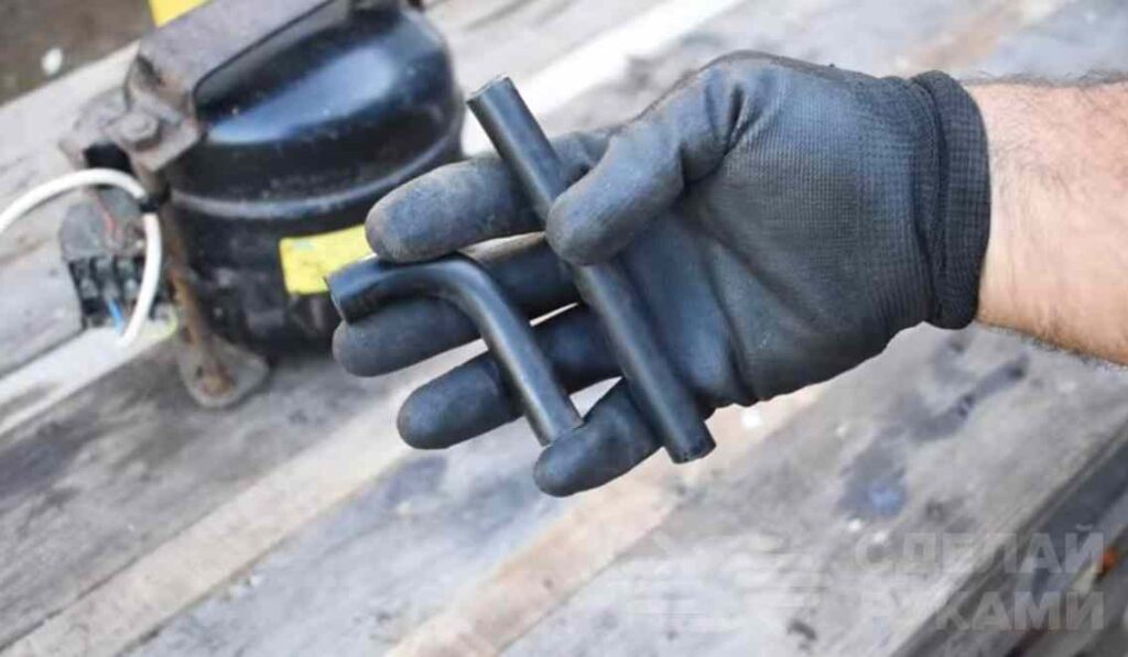 После этого в резиновый отвод автор вставляет прямую медную трубку диаметром 8 мм.