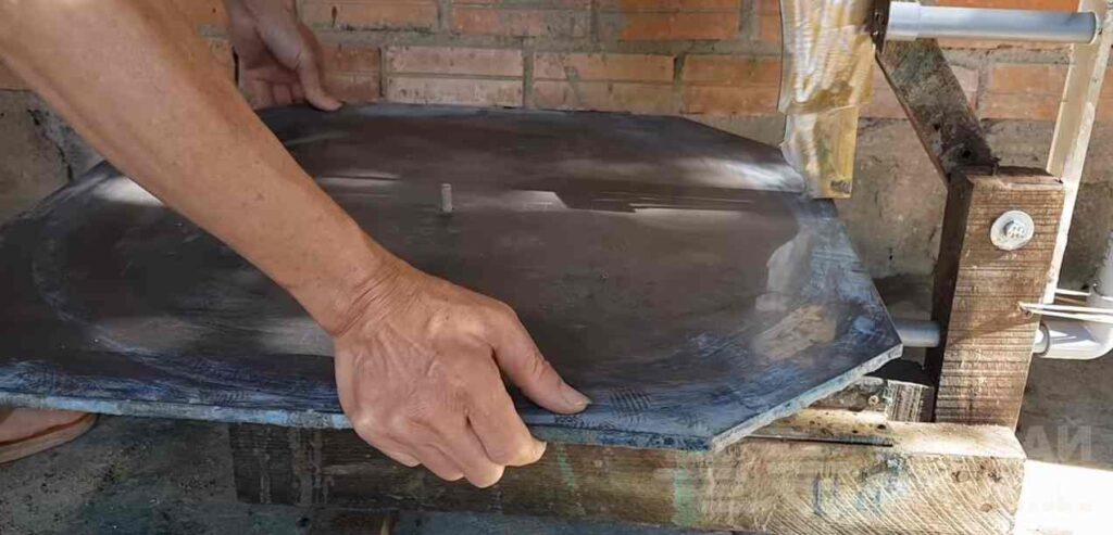 На поворотную платформу автор укладывает толстый кусок листового металла подходящего размера (его размер зависит от размера будущего горшка).