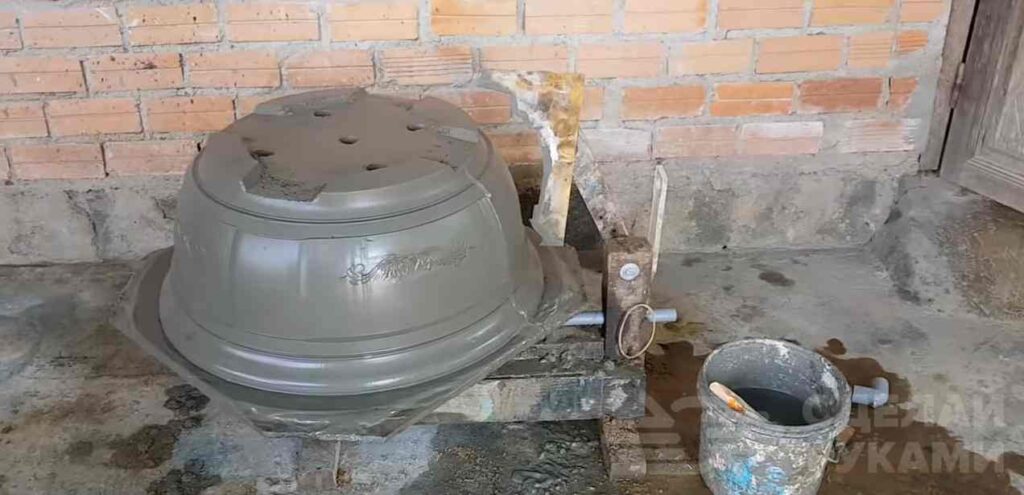 На основу из песка выкладывается цементный раствор. При помощи лекала придается необходимая форма. В качестве армирования автор использует два кольца из стального прутка.