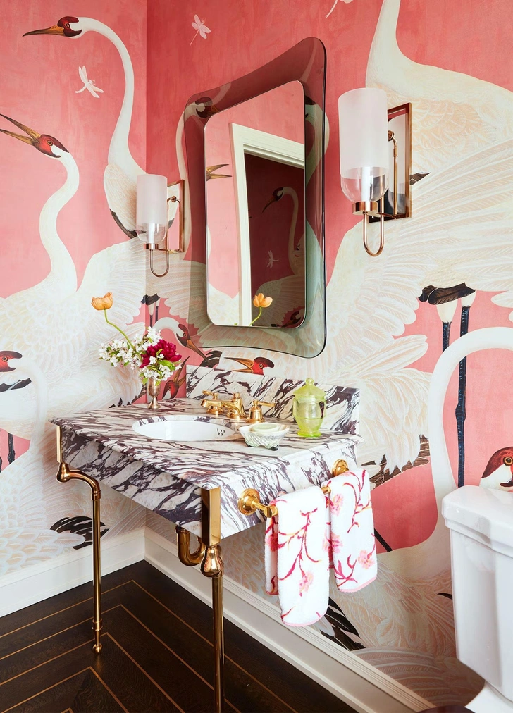 Проект Саммер Торнтон в Чикаго. Обои Gucci. Санузел — самая маленькая комната в доме, а значит, именно здесь можно пойти на творческий риск. Обратите внимание: Уксус 9% – лучшее средство для уборки, о котором мол...