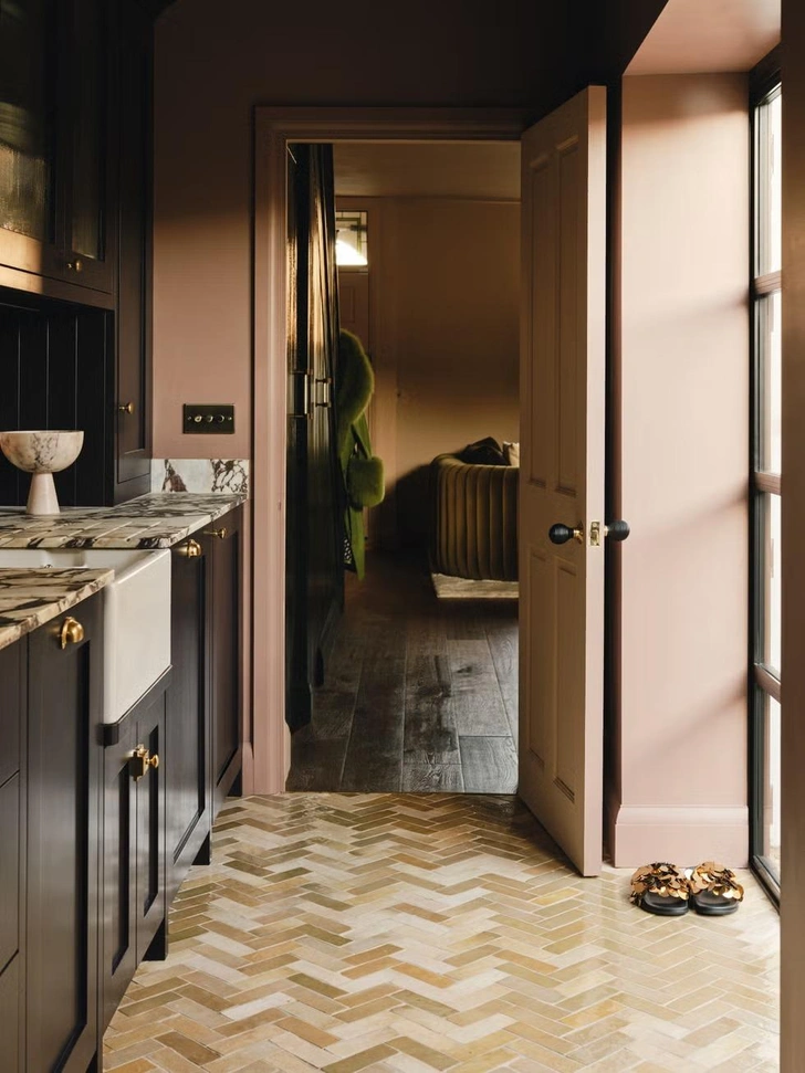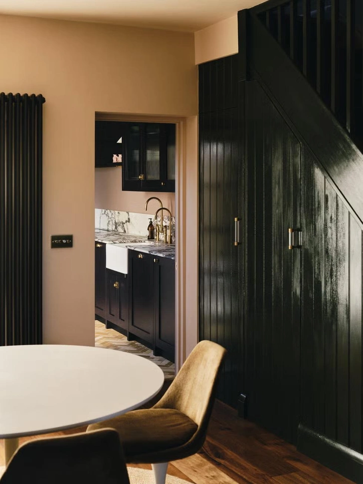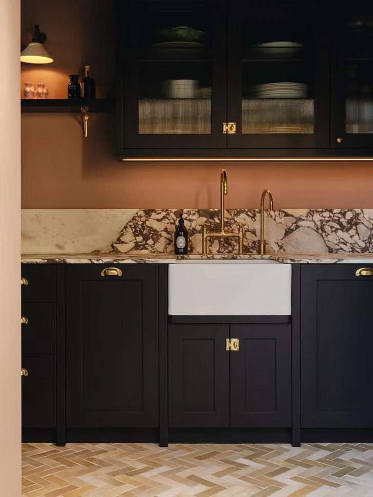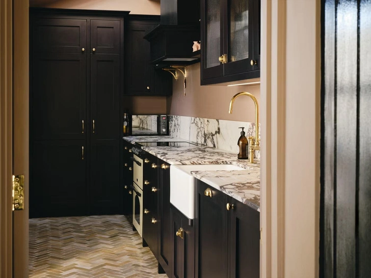 Для шкафов Чарли выбрала черную краску Paean Black от Farrow & Ball с легким фиолетовым подтоном, а латунные ручки купили на Etsy. Стены и потолок покрасили мягким оттенком розового Sulking Room Pink, тоже от Farrow & Ball. Благодаря покраске потолка кухня стала выглядеть уютнее.