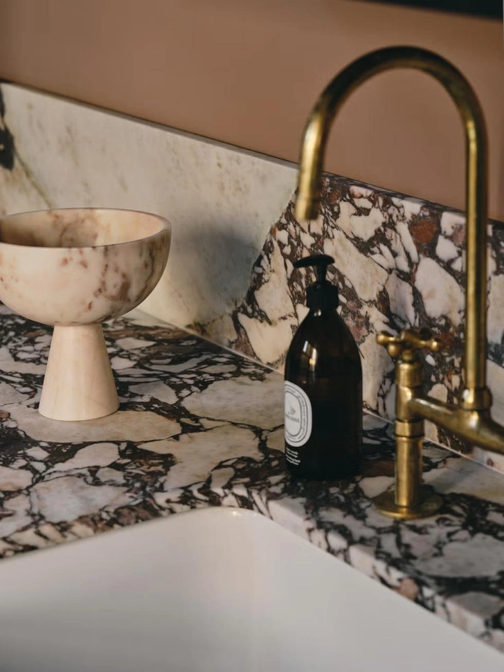 «Я потратила пару месяцев на изучение оттенков краски, плитки и текстур. Я знала, что мне нужна глянцевая плитка, которая отлично смотрится на фоне матовых стен». —рассказала хозяйка. Самая любимая деталь Чарли на кухне — это мраморные столешницы с фиолетовыми прожилками. Она обожает чай, поэтому встроила у раковины кран с прямой подачей кипятка, и это оказалось очень удобно.