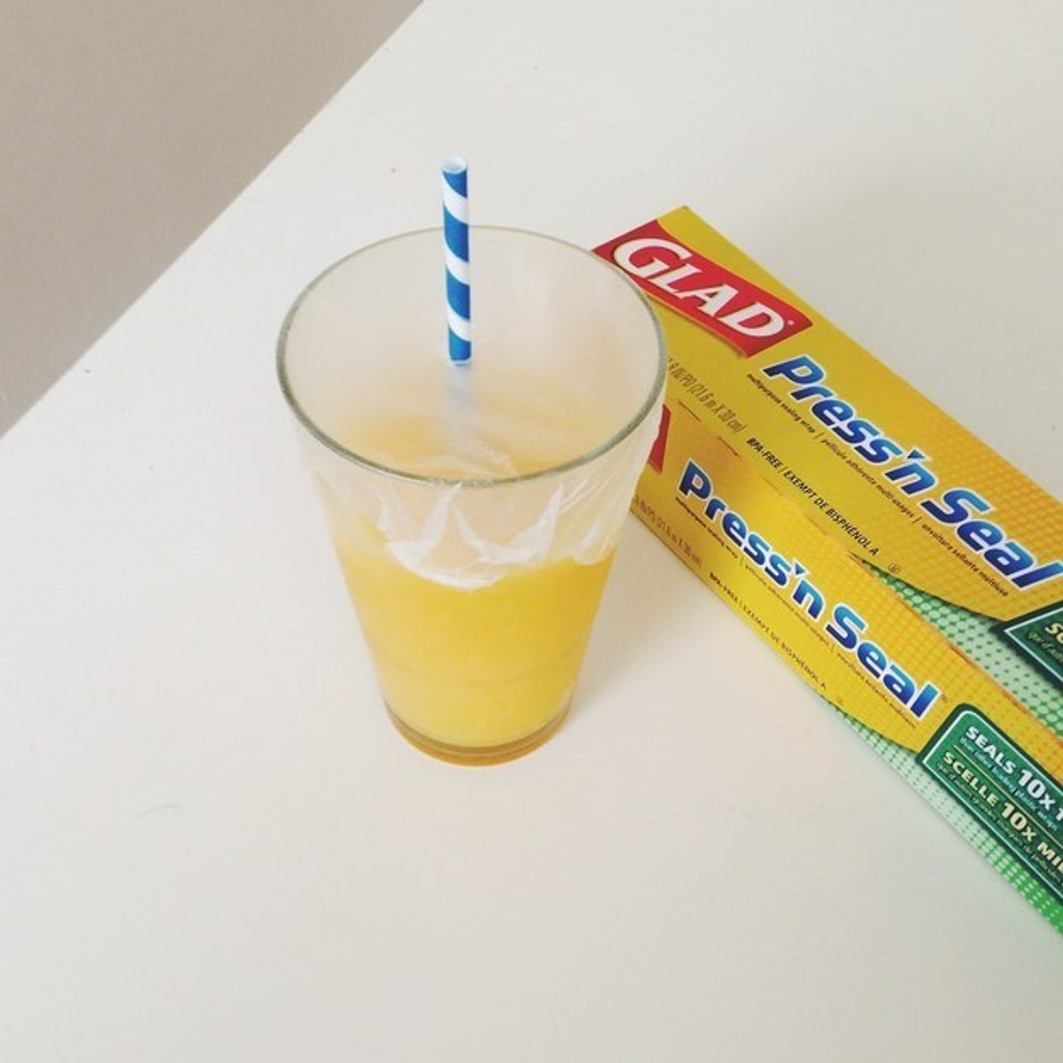 Сделайте стакан-непроливайку для ребёнка или для поездки за пару секунд. Просто натяните пищевую плёнку на горлышко стакана или кружки и проткните в центре отверстие для трубочки. Жидкость не прольётся даже при наклоне. Также плёнка поможет герметично закрыть контейнер: положите её под крышку, и она создаст дополнительный барьер, предотвращая протекание.