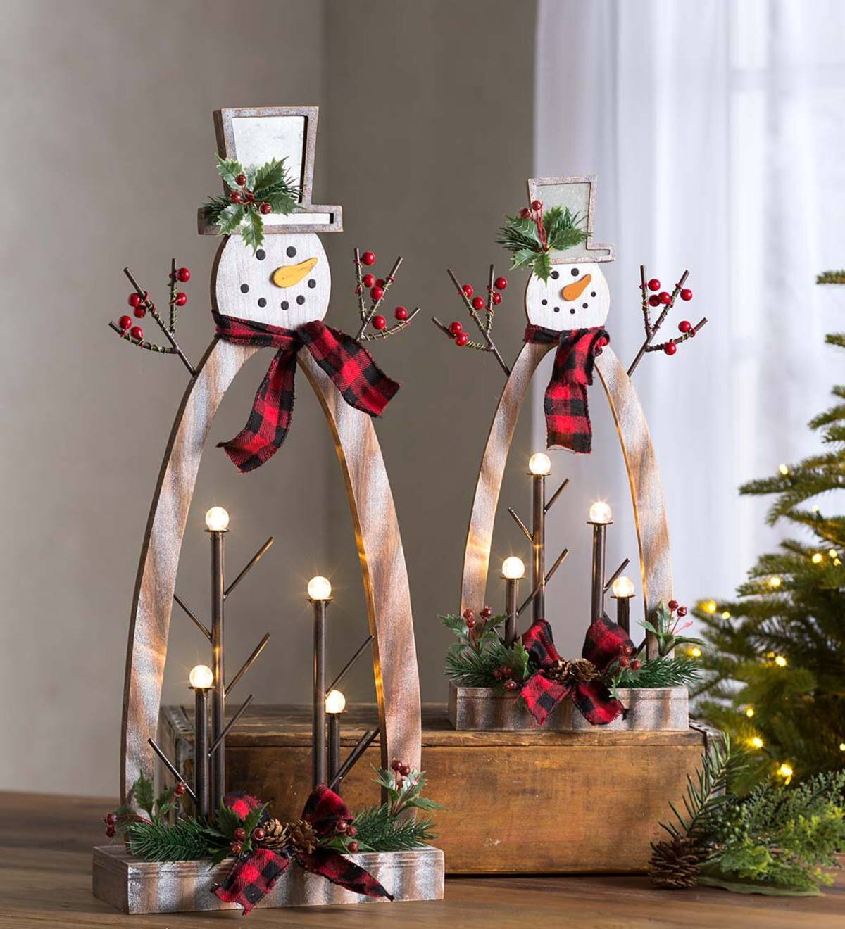 Также обратите внимание на очаровательные светодиодные подсветки в форме ёлочек. Можно выбрать большой фонарь или набор из трёх миниатюрных светящихся ёлок, которые создадут волшебные световые акценты в интерьере.