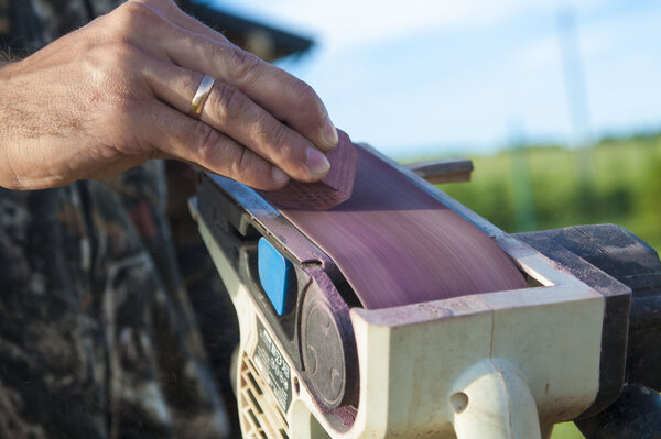 Теперь про само производство: муж закрепил шлифовальную машинку тисками на нашем новом столе в саду.