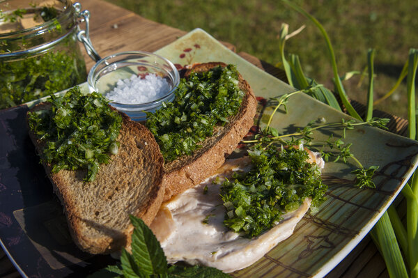 Для рецепта понадобится: пучок свежего укропа, молодой чеснок, немного тимьяна, крупная соль и оливковое масло. Зелень и чеснок нужно очень мелко нарезать, затем добавить соль и тщательно растереть её с зеленью. Это нужно для того, чтобы выделился сок и масса стала однородной.