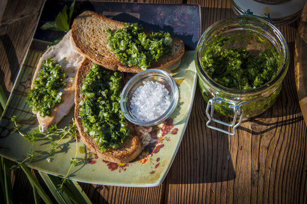 Этот простой и универсальный соус, который также может служить закуской, готовится из свежей, молодой зелени. Сейчас — идеальное время, особенно для мяты: пока она не зацвела, её листочки самые сочные и ароматные, идеально подходящие для десертов и приправ. Позже, в разгар лета, из неё можно будет сварить чудесное варенье с черникой.