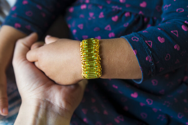 еще и капельку супер-клея капнуть, чтоб наверняка не расстегнулись булавочки. Мой браслет за вечер не расстегнулся, потом, конечно, с дочки сняла.