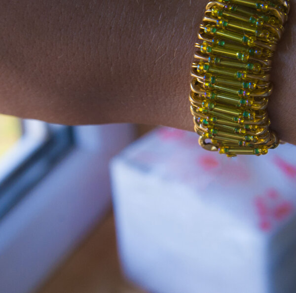 Больших булавок не осталось, зато маленьких - очень много! Нанизывала на них бисер и стеклярус, а потом - повесила на резиновую веревочку для бисерного браслета: