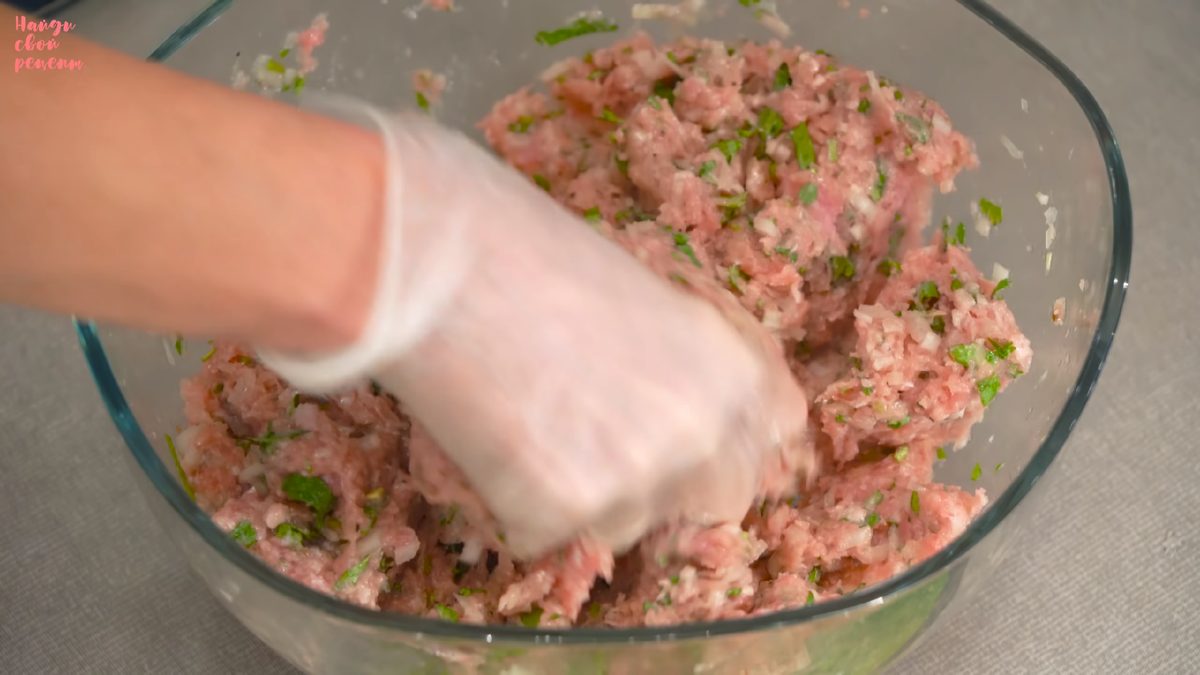 Для начинки в миску с фаршем добавьте мелко нарезанный репчатый лук, нарубленную кинзу, зиру, молотые перцы и соль. Затем влейте холодную воду — именно она в процессе варки превратится во вкуснейший бульон внутри хинкали. Тщательно перемешайте все ингредиенты руками до однородной, сочной массы.