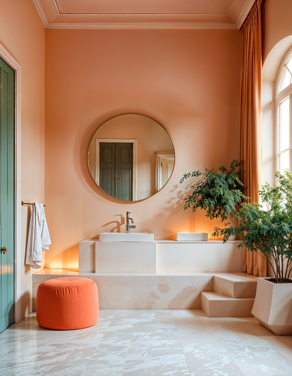 Эти цвета великолепно сочетаются с акцентами из бронзы, латуни или золота. Такие металлические элементы придают пространству налёт роскоши и отлично вписываются даже в классические интерьеры. Важно помнить, что пастельная гамма обладает доказанным психологическим эффектом: она успокаивает нервную систему, помогает снять стресс и мягко заряжает энергией, что особенно ценно для помещения, предназначенного для утренних и вечерних ритуалов.