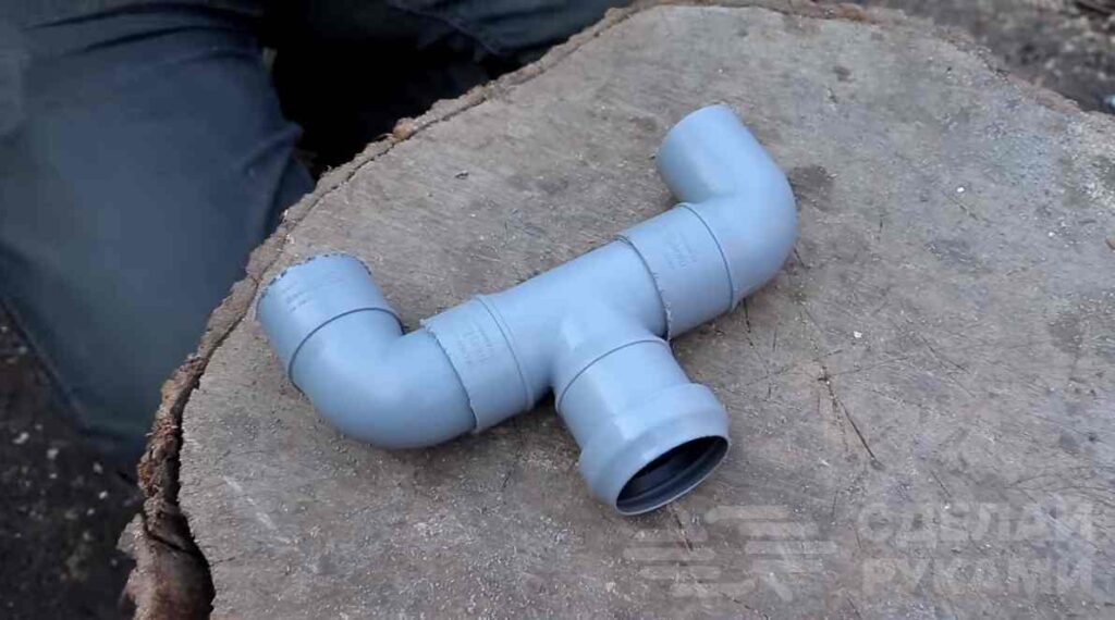 В верхнюю часть ПВХ труб автор вставляет пластиковые заглушки. Затем нужно соединить вместе два уголка и тройник.