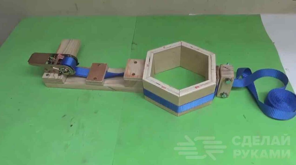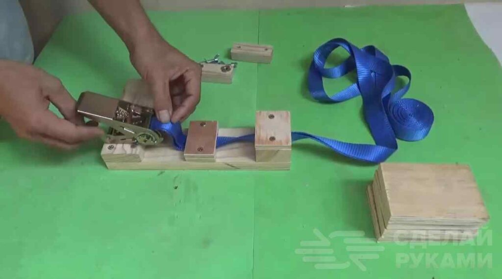 По центру основания автор крепит с помощью клея еще несколько кусков фанеры. Затем пропускает ремень через получившиеся отверстия, и заводит его конец в трещотку.