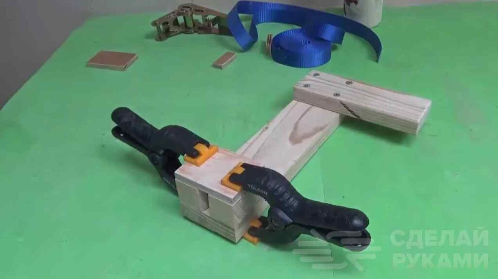 Для изготовления столярного зажима потребуется ремень с трещоткой (можно заказать в интернете), а также заготовки из дерева или фанеры.