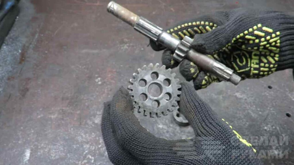 Первым делом при помощи болгарки необходимо укоротить вал, на котором находится маленькая шестеренка. Он должен выступать с обеих сторон шестеренки на 25 мм.