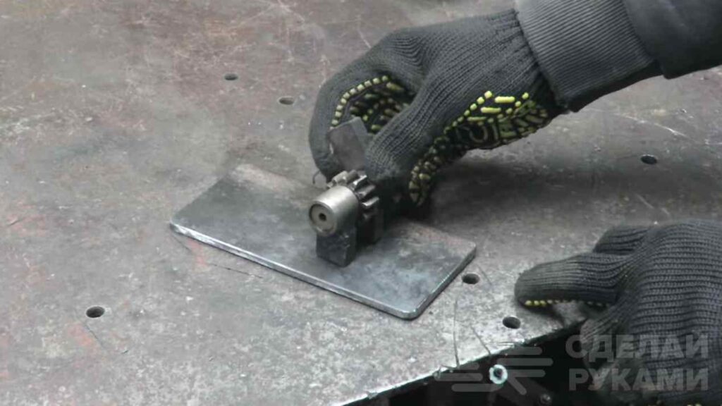 Затем автор изготавливает два крепежных «уха» и приваривает вторую деталь к основанию самоделки.