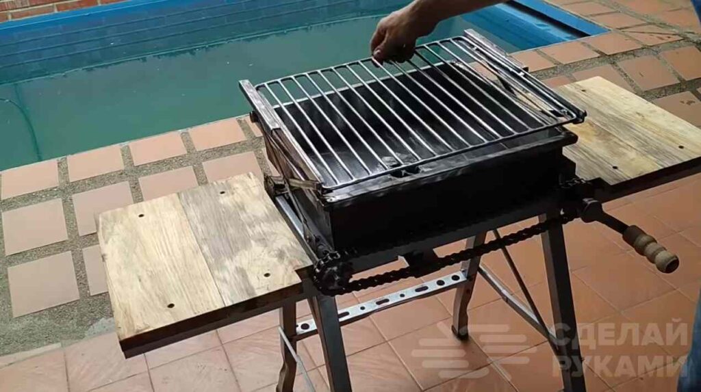 В данном обзоре автор показывает, как своими руками изготовить практичный в использовании гриль-барбекю с подъемным механизмом.