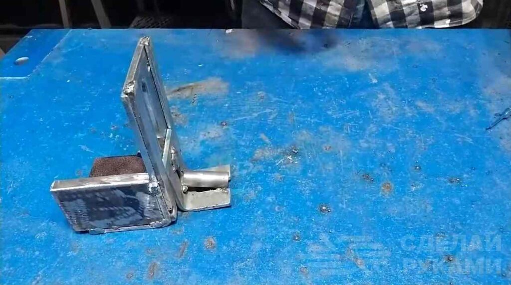 Основные элементы самоделки — это два металлических уголка разного размера. Большой уголок является неподвижным и выступает в качестве рамы, а маленький — перемещается вверх-вниз.