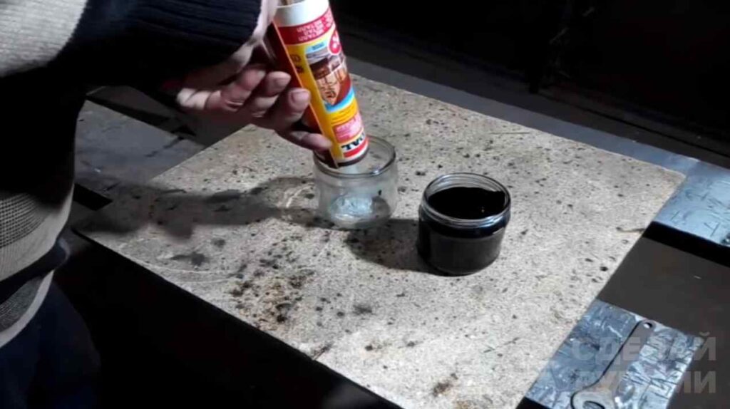 В другой емкости автор разводит самый дешевый силиконовый герметик с бензином (можно тоже использовать самый дешевый).