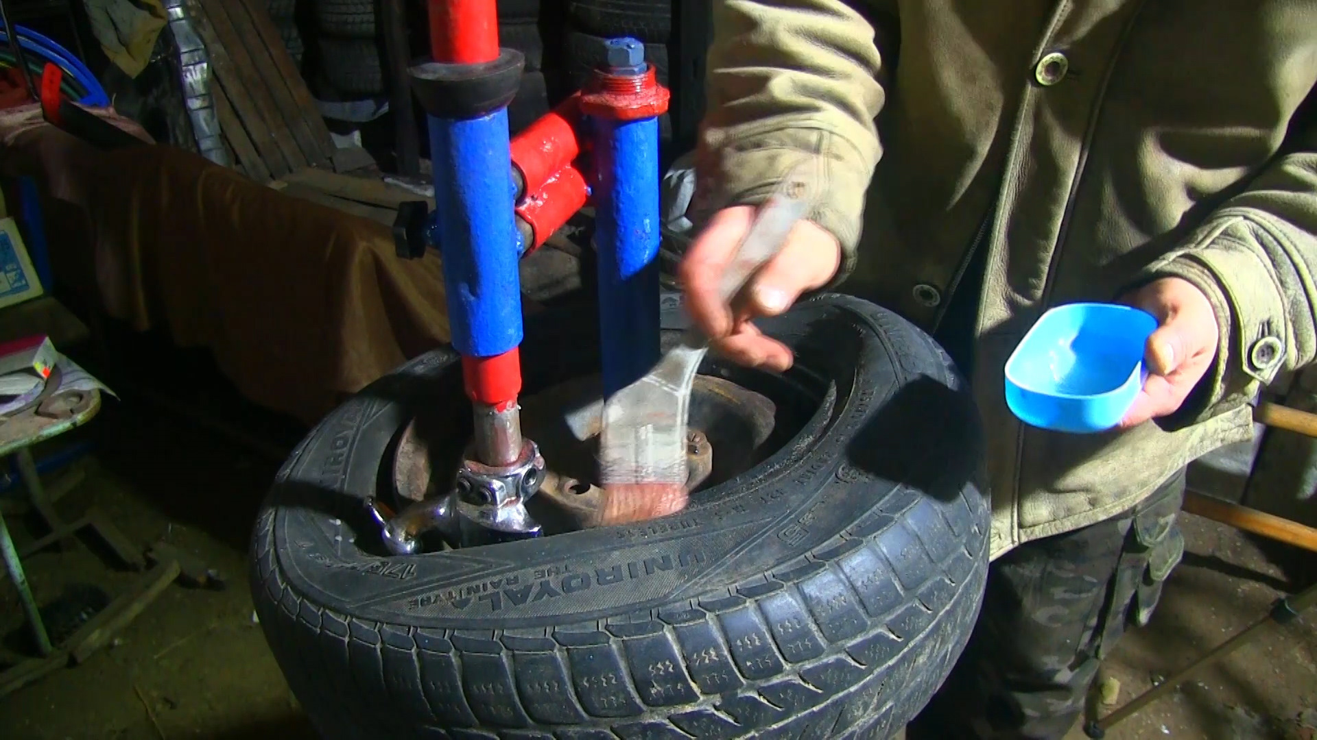 Для непосредственного монтажа и демонтажа шины понадобится специальный инструмент — монтажная лопатка («монтажка»), которую также можно изготовить самостоятельно из подручного металла. Чтобы облегчить процесс срывания покрышки с диска, к стойке крепится дополнительный рычаг с упором — он создаёт необходимое усилие и минимизирует физическую нагрузку.
